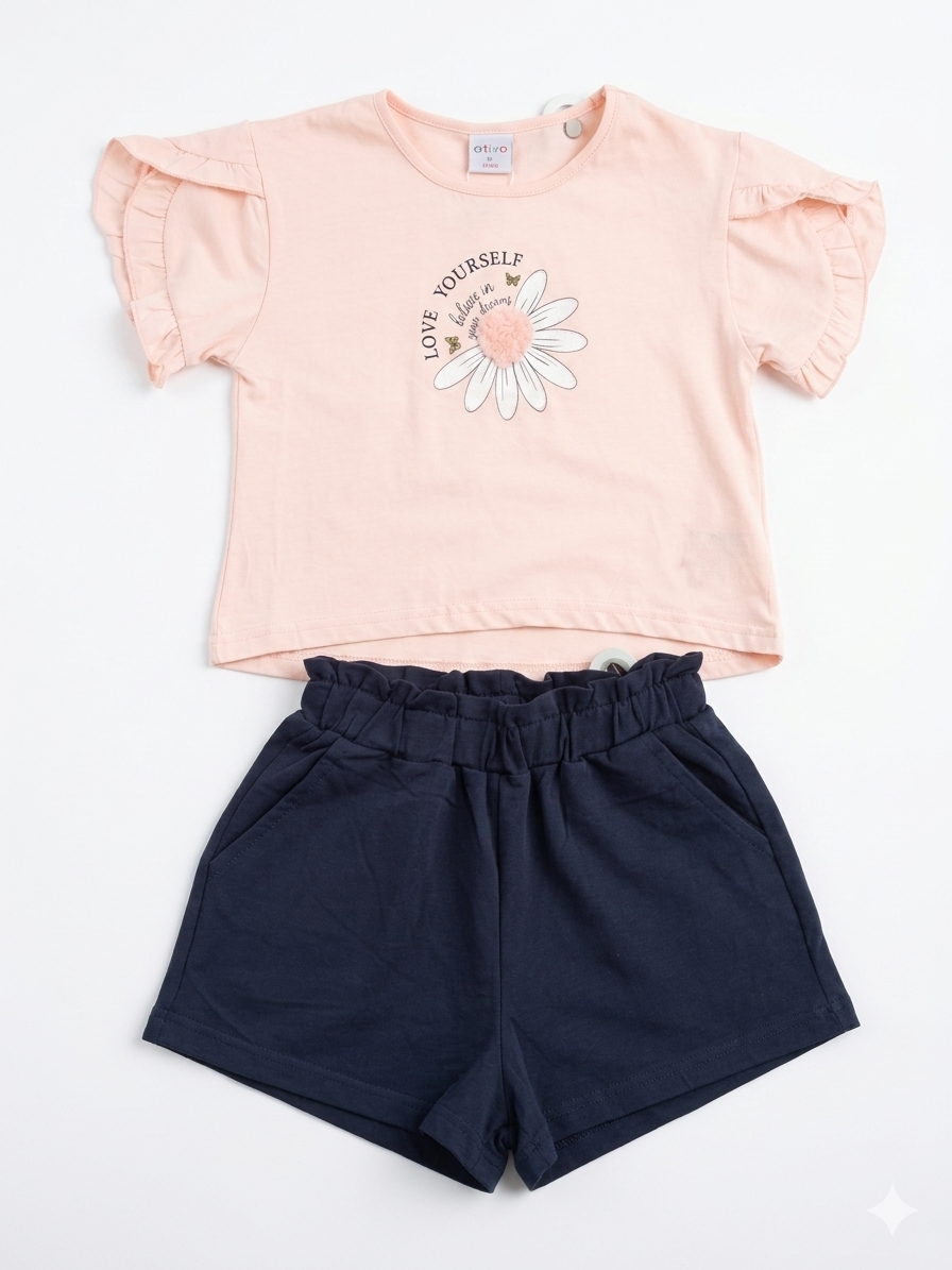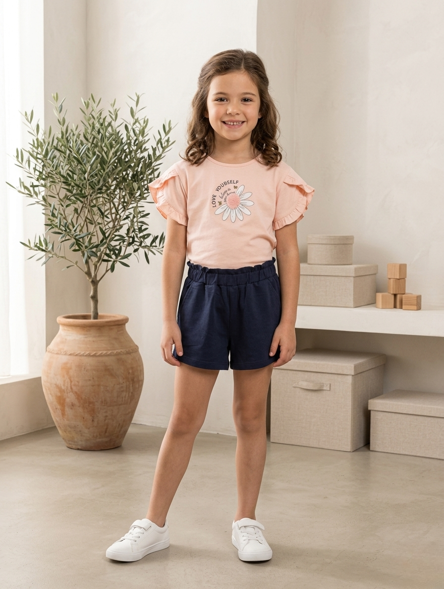 Dulce, cómodo y lleno de energía positiva. Este conjunto de dos piezas combina una camiseta rosa melocotón con alegres mangas de volantes y un gráfico de margarita motivador, junto a unos shorts azul marino con cintura elástica paperbag. El look perfecto y coordinado para sus juegos de verano.