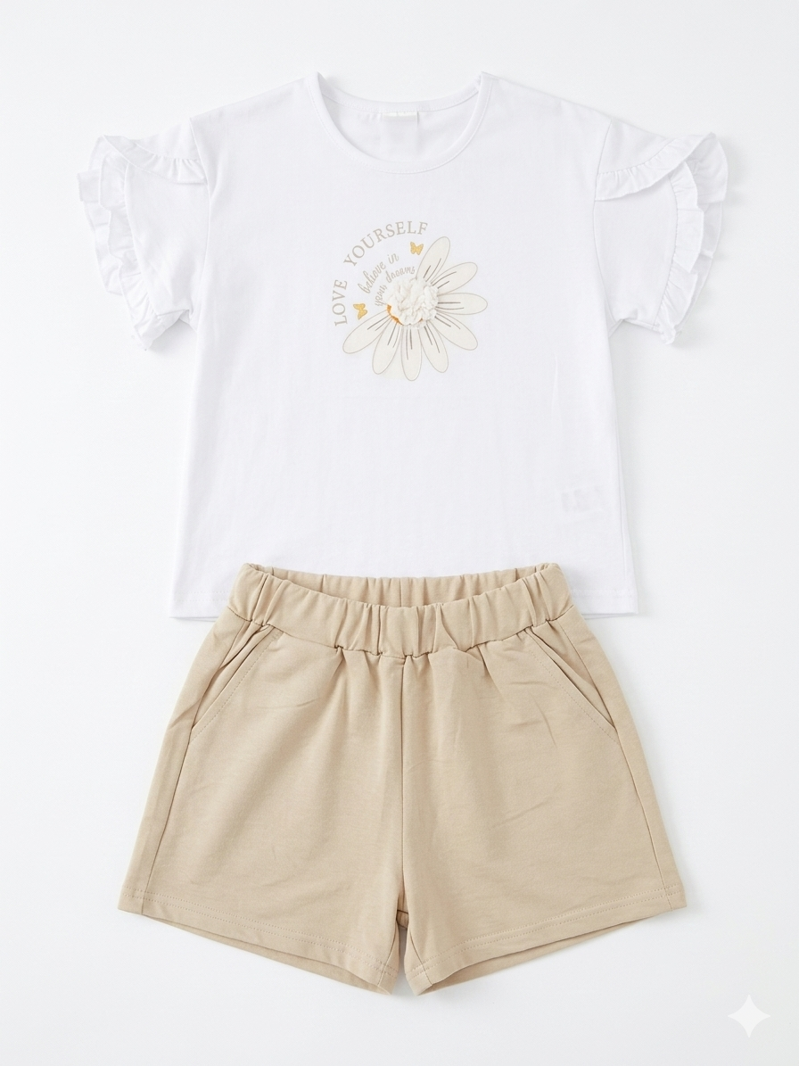 • Camiseta Gráfica con Mensaje Positivo: Confeccionada en algodón ligero, presenta un diseño central de una margarita blanca y rosa texturizada, acompañada de las frases «LOVE YOURSELF» y «believe in your dreams». Destaca por sus mangas de doble volante, que aportan un toque muy dulce y femenino.