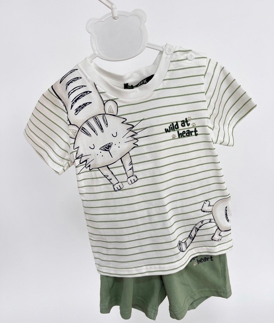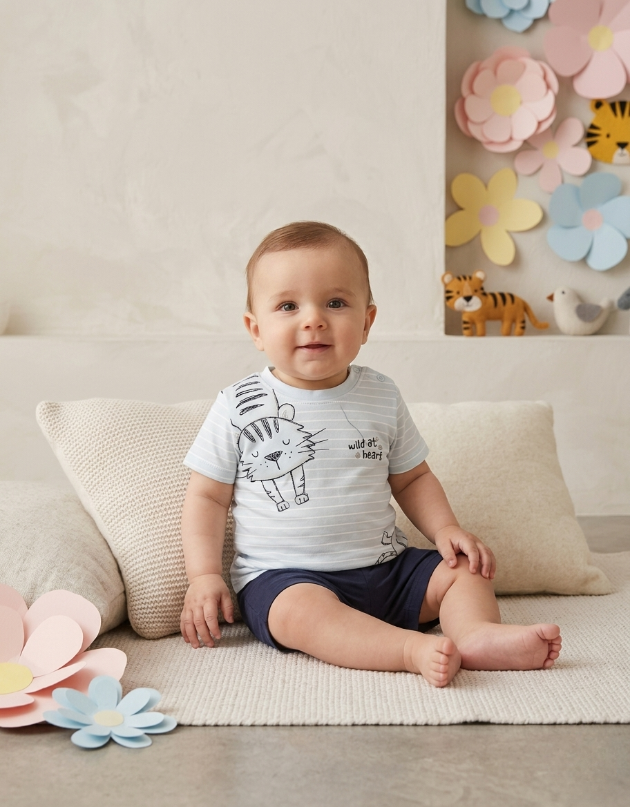 Acompaña los días de juego y descubrimientos de tu pequeño con este conjunto diseñado para el máximo confort. Combinando un estampado alegre y detalles cuidados, esta prenda es la opción perfecta para un look desenfadado y lleno de personalidad durante la temporada de verano.