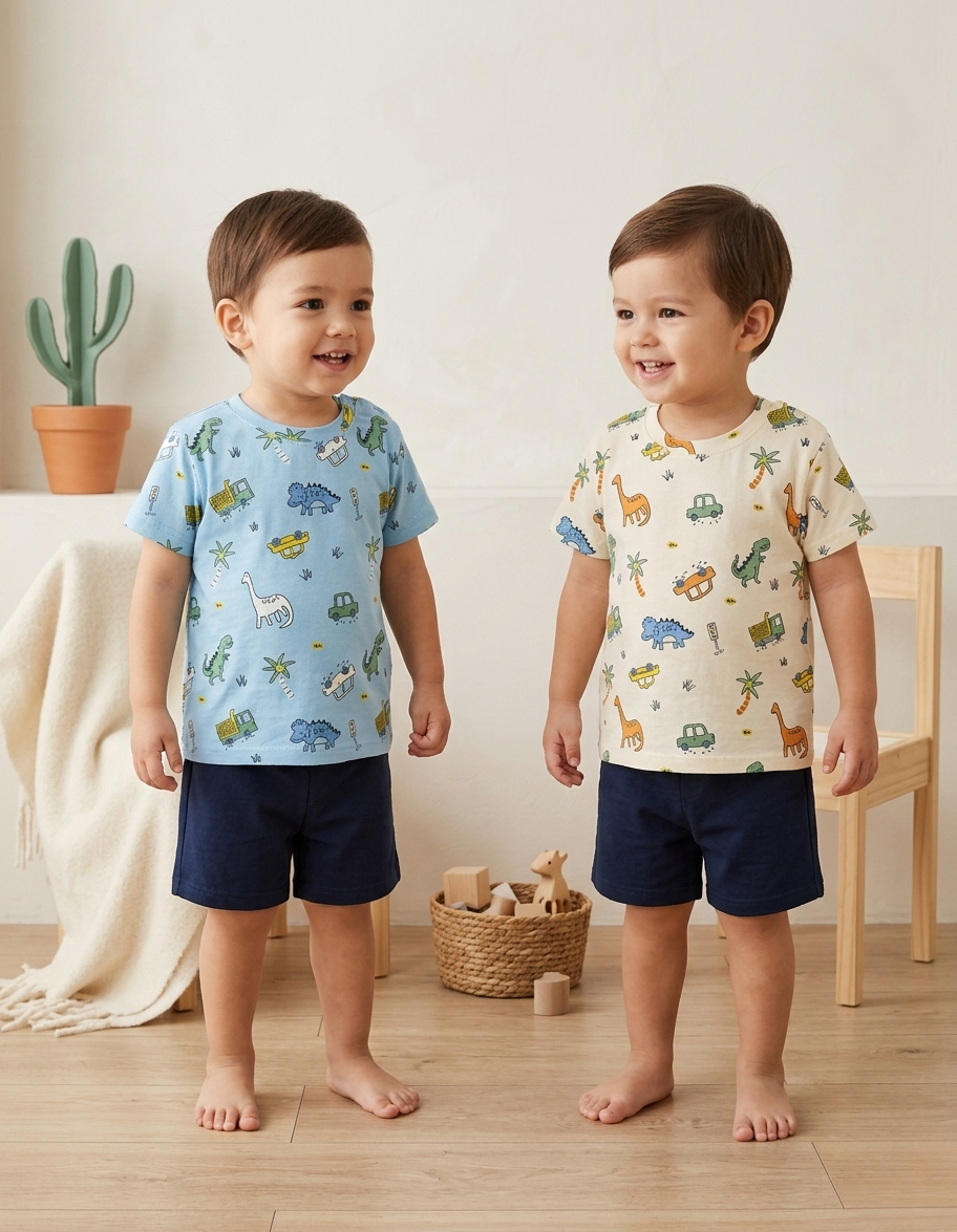 • Camiseta de Algodón Suave: La parte superior destaca por su divertido estampado «all-over» que mezcla el mundo de los dinosaurios con vehículos y elementos de la naturaleza. Está confeccionada en algodón de alta calidad que mantiene la frescura incluso en los días más calurosos. Además, cuenta con botones de presión en el hombro (en tallas de bebé) para facilitar el cambiado.