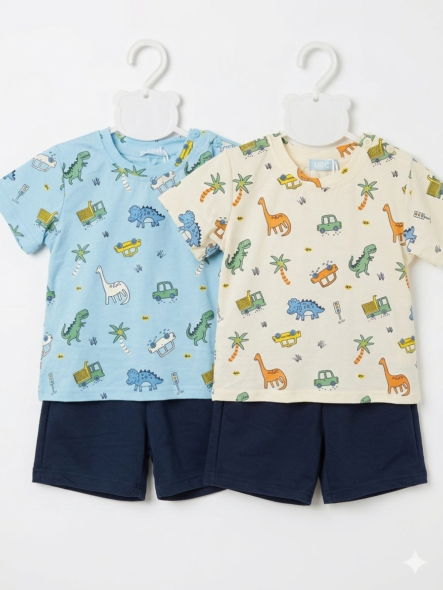 Conjunto de dos piezas para niño con estampado de dinosaurios y vehículos. Un set fresco y divertido diseñado para el juego diario. Incluye una camiseta de algodón con un alegre estampado de dinosaurios, coches y palmeras, combinada con unos shorts cómodos en color azul marino. Disponible en dos colores de camiseta: azul cielo y crema.