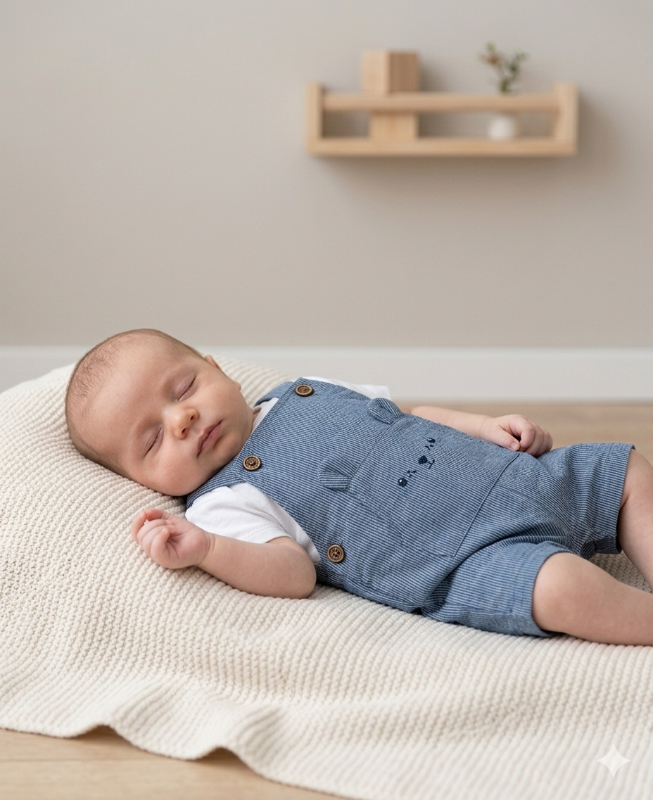 Acabados de Calidad: Los tirantes y los laterales del peto se ajustan con botones de efecto madera, aportando un toque artesanal y distinguido a la prenda. El corte de las perneras es holgado, permitiendo el uso cómodo del pañal y libertad total de movimiento.