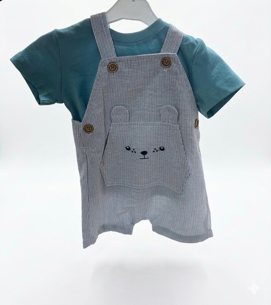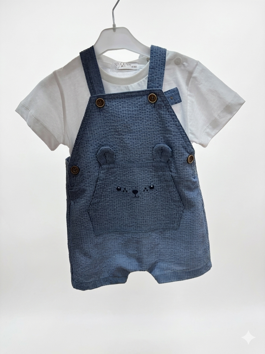 Peto Detallado: El peto corto destaca por su tejido de micro-rayas en azul denim suave. El panel frontal cuenta con un bolsillo tipo canguro donde asoman dos pequeñas orejitas en relieve, complementado con un bordado minimalista de carita de osito.