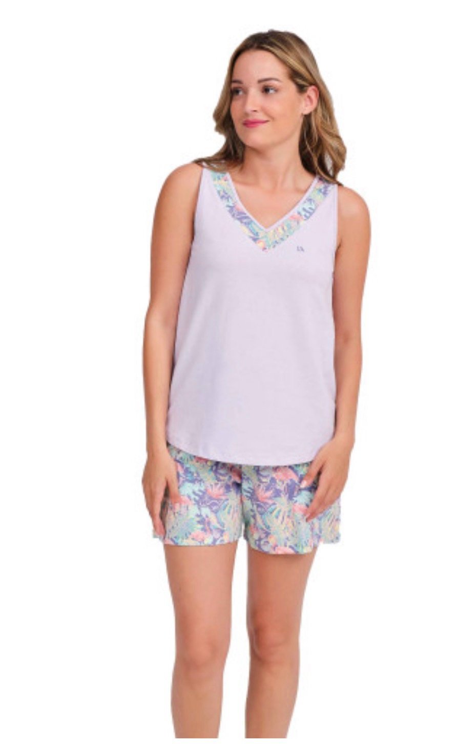 Estampado Vibrante: El pantalón corto destaca por su print botánico en tonos pasteles (verdes, corales y azules), aportando un aire alegre y veraniego.