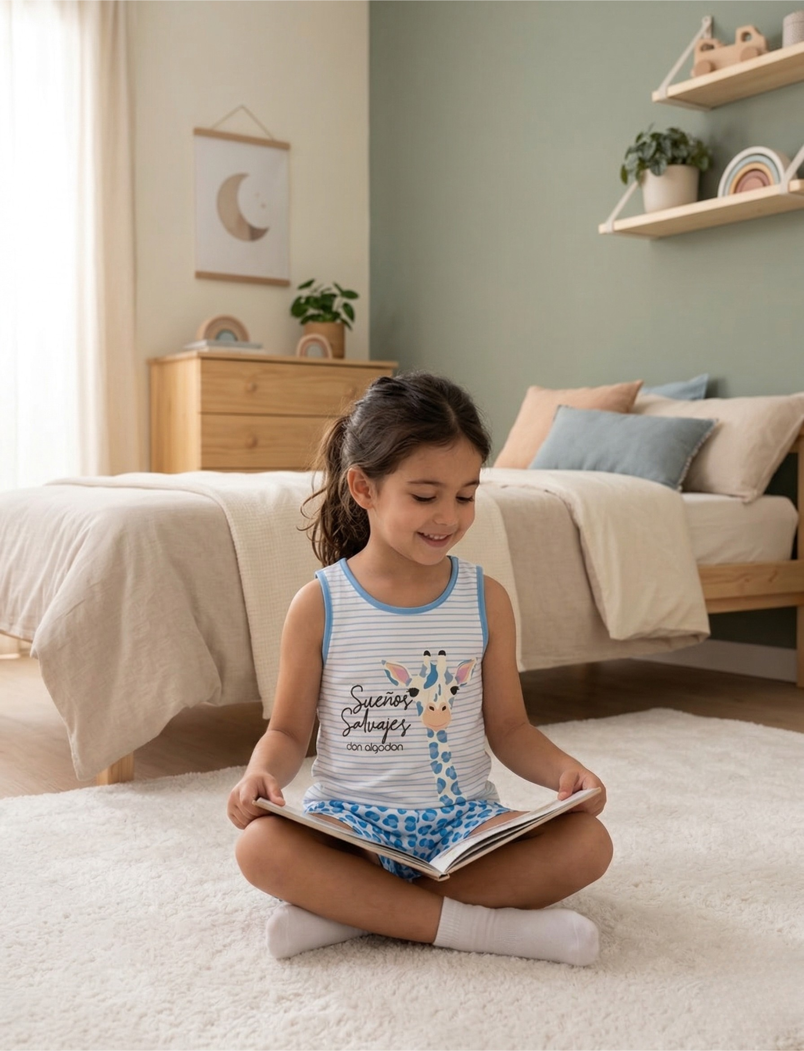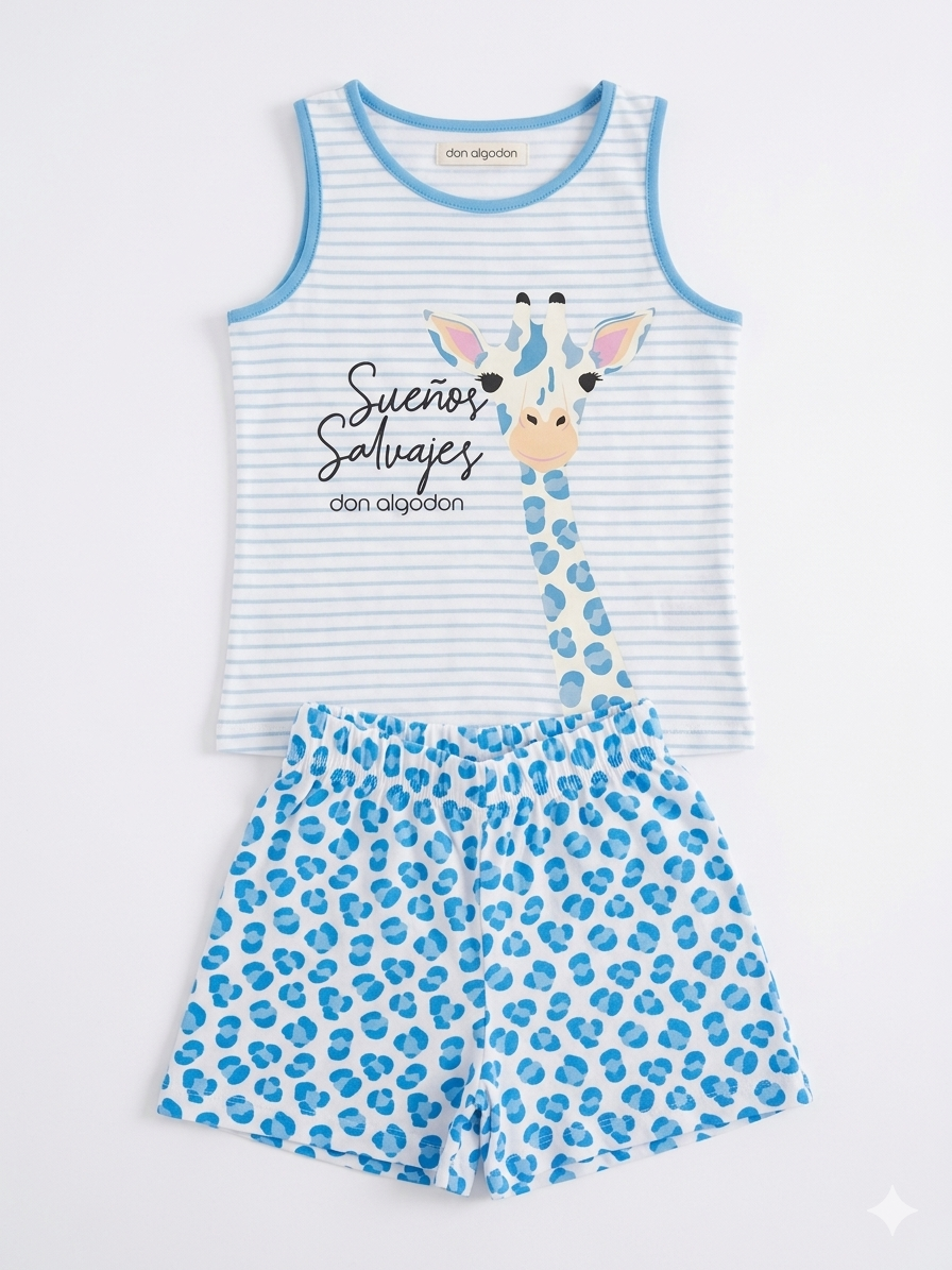 Pijama Niña Don Algodón «Sueños Salvajes» – Algodón 100% Prepara a los más pequeños para una noche de descanso llena de aventuras con este conjunto de dos piezas. Combina una camiseta de tirantes con estampado de jirafa y rayas marineras con un pantalón corto de print animal en azul eléctrico. Un diseño fresco, divertido y extremadamente cómodo para las noches de verano.